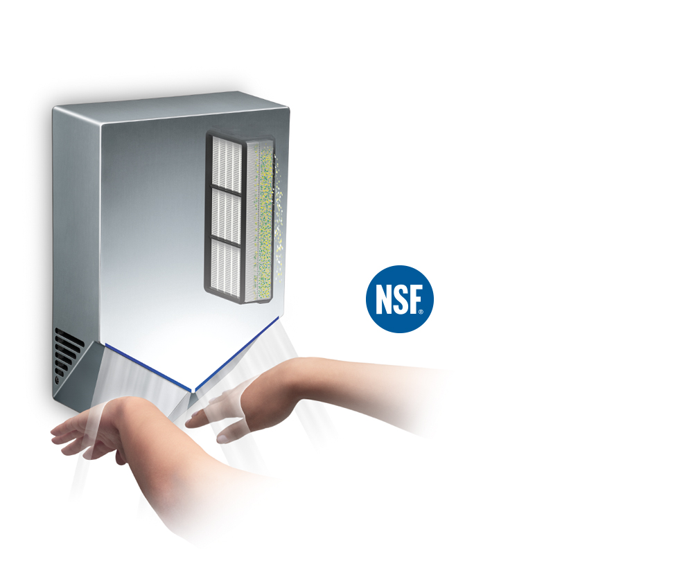 Uscătorul de mâini Dyson Airblade V are două filtre HEPA, câte unul de ambele părți ale aparatului. Fiecare filtru reține 99,95% din particulele de dimensiunile bacteriilor aflate în aerul toaletei.
